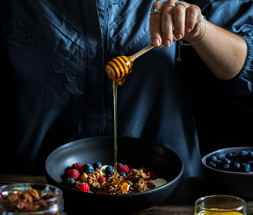 I think my love for honey would rival Pooh himself but as a fully grown adult, I unfortunately cannot digest quite as much as this little bear & need a little balance in my diet. Exploring healthier ways to enjoy my favourite sweets treats though is all part of the fun in the kitchen, challenging as it may be sometimes. This simple but sweet granola recipe however is far from challenging & not only gives me the sweet hit of golden nectar but also packs in some nutrition to start the day. Don’t get my wrong, granola is by far not the healthiest thing in the world but when it’s homemade you cut out all of the unnecessary fats & sugars present in the store bought varieties, plus you can tweak it to suit your tastes. This is my base recipe which I use as a guide, which nuts, seed or fruit I throw in will depend on either my mood or what I’ve got to hand that day but it always turns out delicious. If all of this makes into the jar when you make it, not even a little nibble then you’re a stronger person than I am, it’s incredibly moreish!