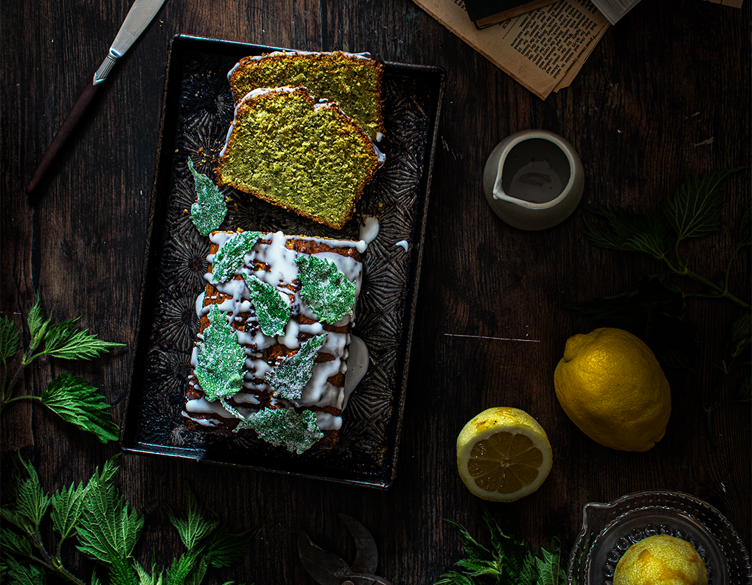 Just a brief cooking in hot water & drying removes all of the stinging hairs from the plant, making them safe to eat, it’s as simple as that. I’m pretty sure stinging nettle are probably one of the most easily identifiable plants to forage for here in the UK, not only because it’ll pretty much grow anywhere but I’m willing to bet most of us learnt the hard way growing up! Be sure to use gloves when you’re out foraging for them though & avoid polluted areas such as busy roads. Nettle has a bright, peppery yet earthy flavour which I think works well paired with the sharp bitterness of lemon. Here in my lemon & nettle cake I’ve used it in three ways, firstly pureed, which turns this little loaf into a bright, vibrant green wonder. Secondly, I’ve used the cooked leaves within the cake, adding a little texture. And finally, because I can’t resist a little bit of natural decoration, I thought I’d try to crystalise some of the cooked nettle sprigs which worked surprisingly well & I’ve placed proudly a top my cake, giving you plenty of advance warning as to what it contains.