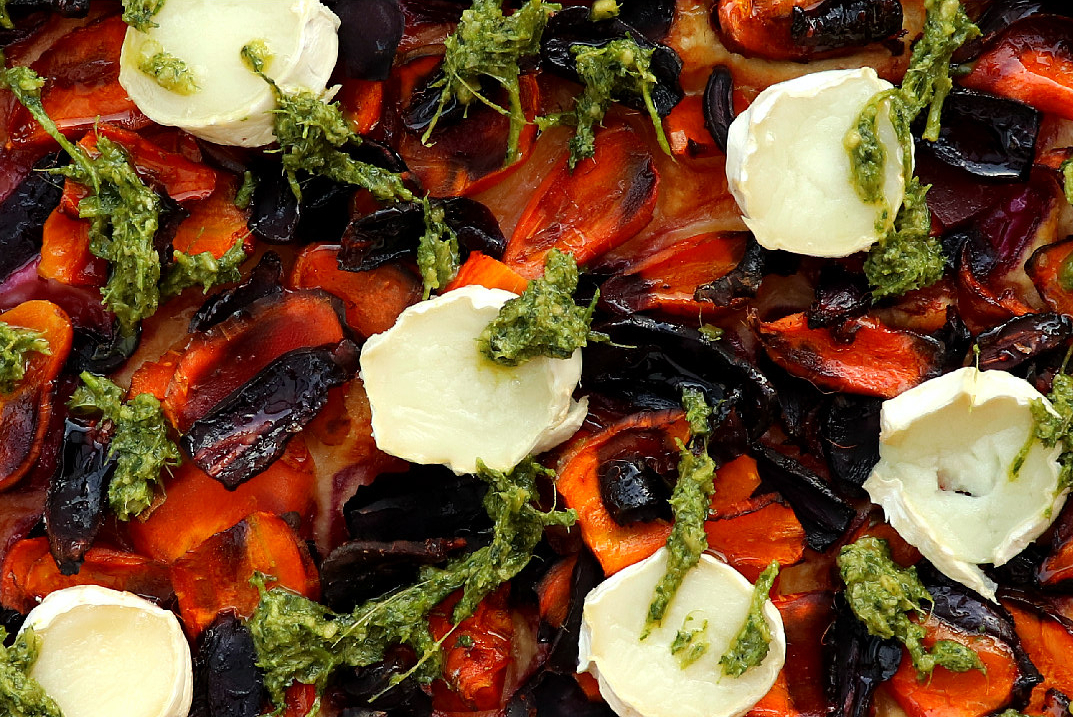 Honeyed Carrot & Goats Cheese Tart with Carrot Top Pesto